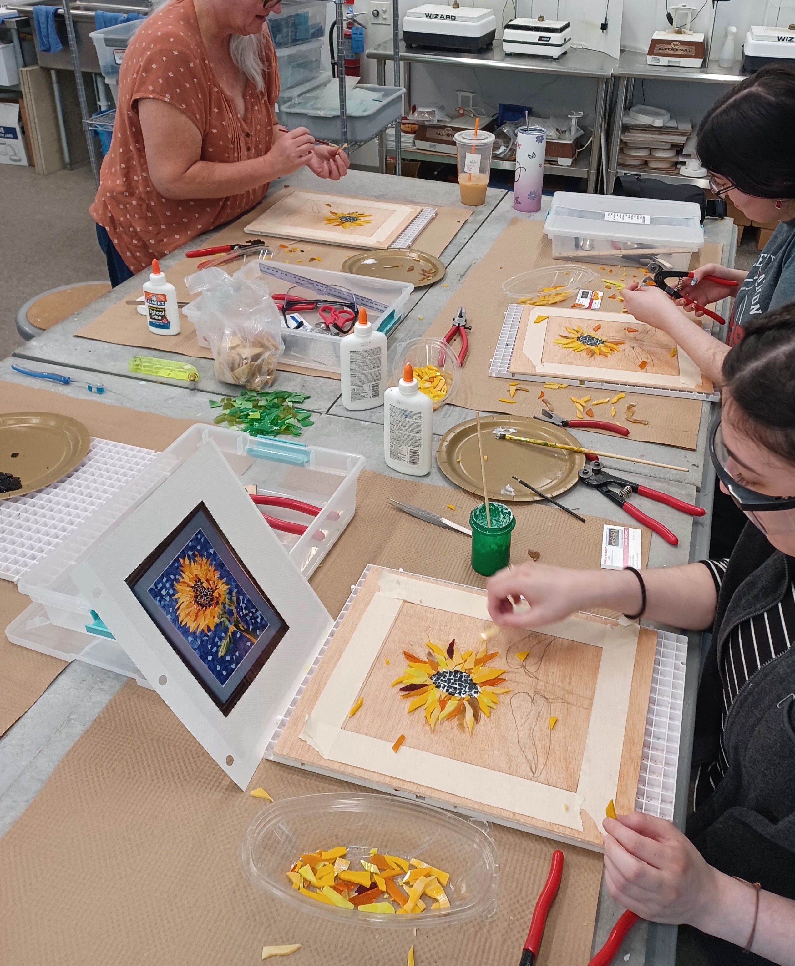Original mosaic pieces and hands-on instruction in the craft of tile and glass.